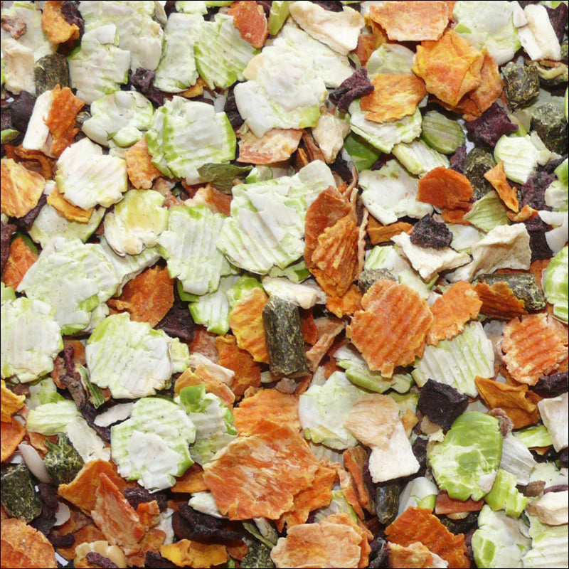 Gemüse-Mix ist ein natürliches Ergänzungsfuttermittel ohne Farbstoffe, Aromastoffe, Konservierungsstoffe und andere synthetische Zusatzstoffe.